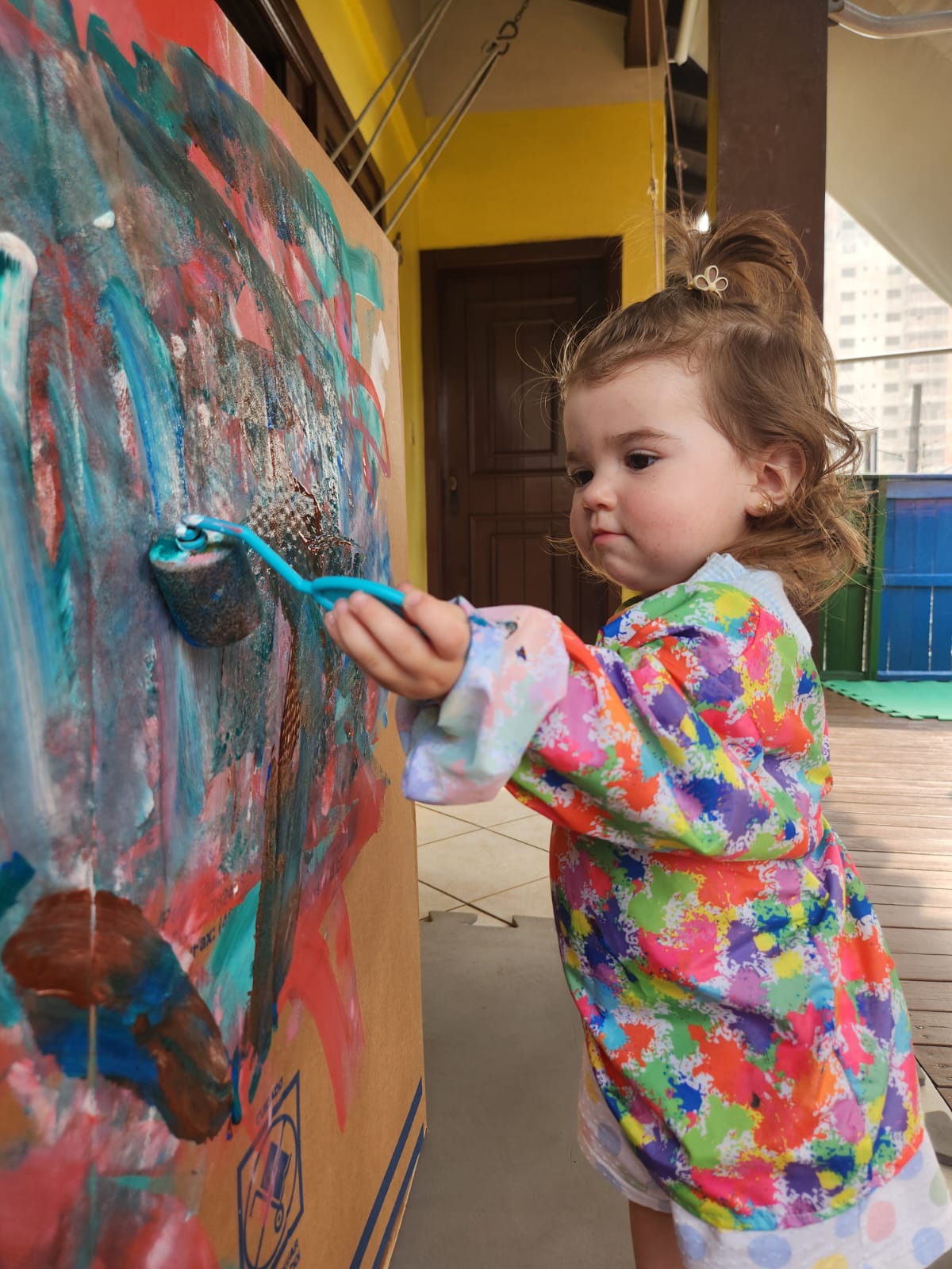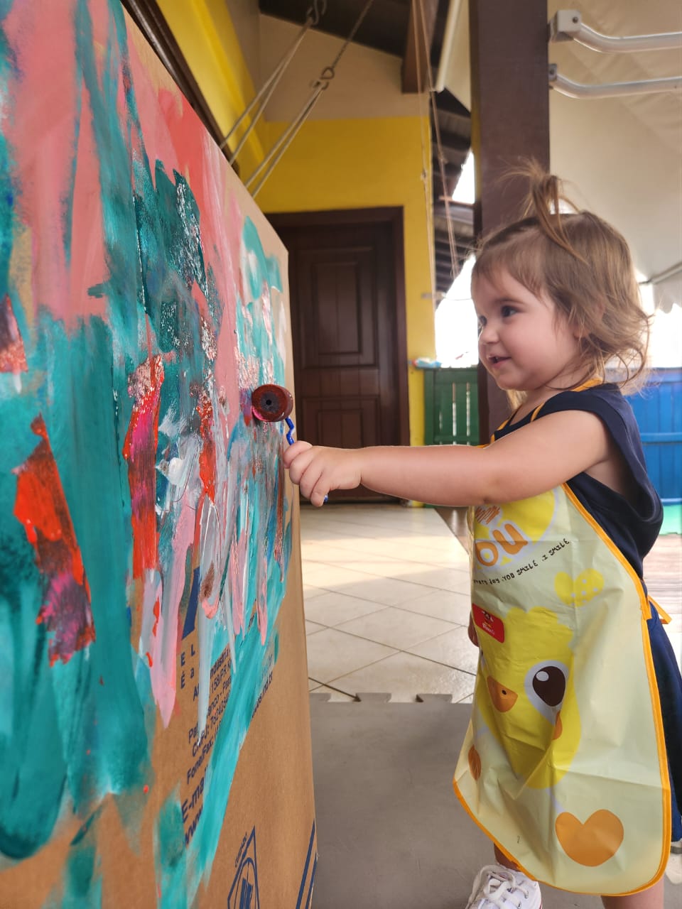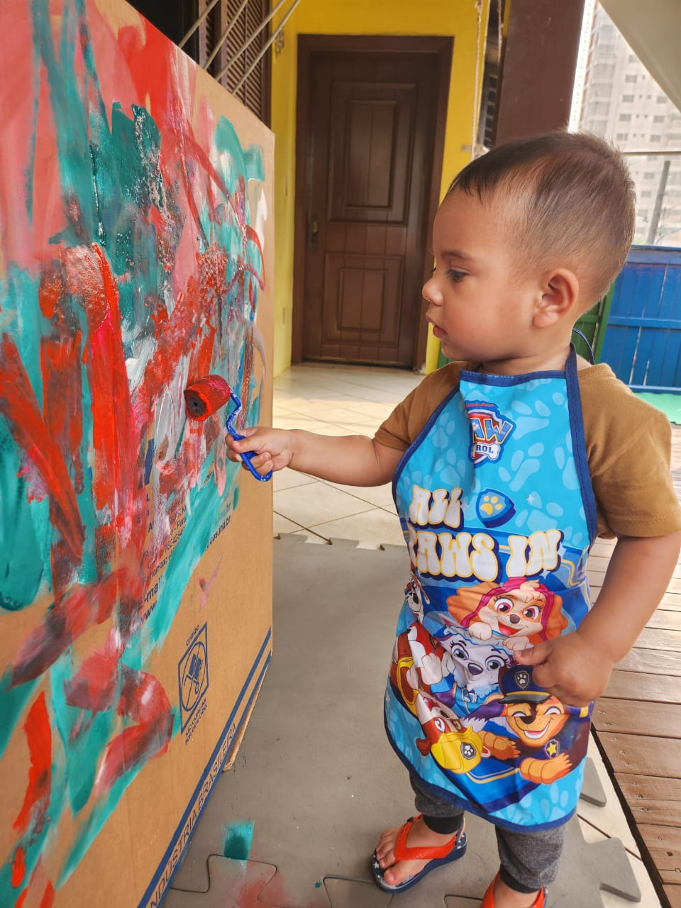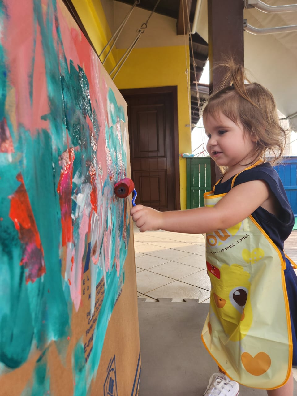 A atividade de pintura com tinta e rolos, estimula a coordenação motora fina, fundamental para o controle dos movimentos das mãos e dedos, habilidades essenciais para futuras tarefas como escrever e desenhar.