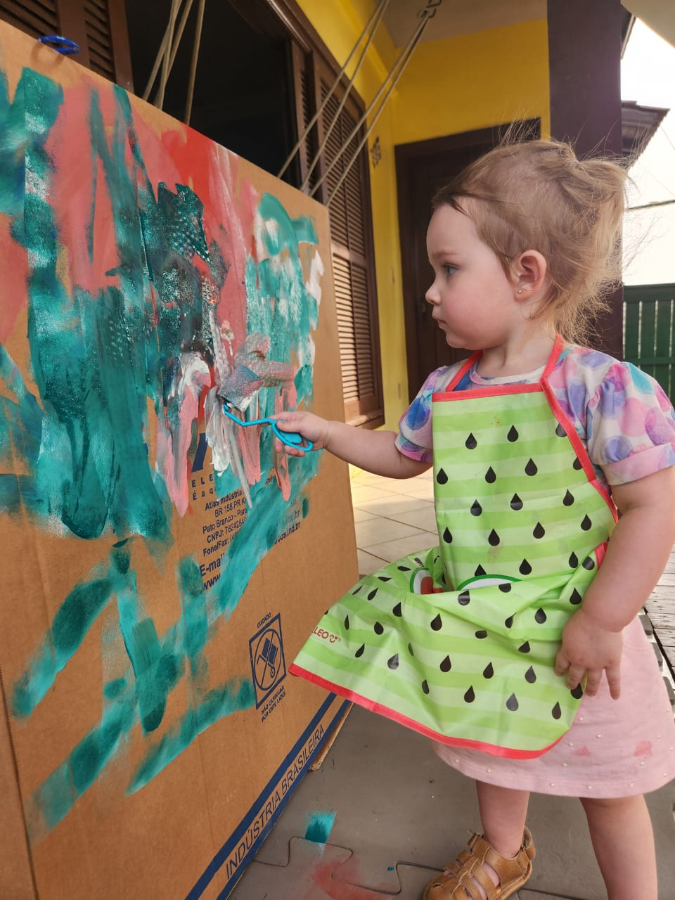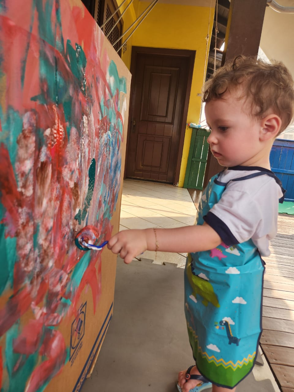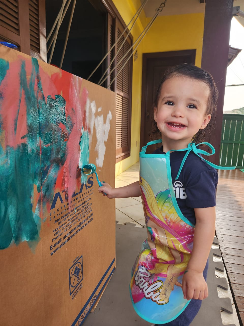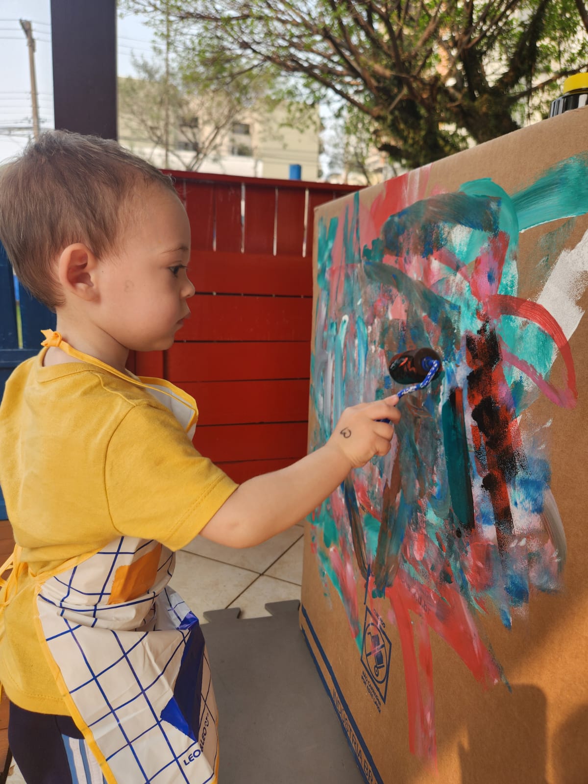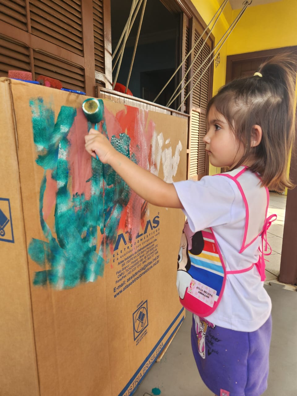 A atividade de pintura com tinta e rolos, estimula a coordenação motora fina, fundamental para o controle dos movimentos das mãos e dedos, habilidades essenciais para futuras tarefas como escrever e desenhar.