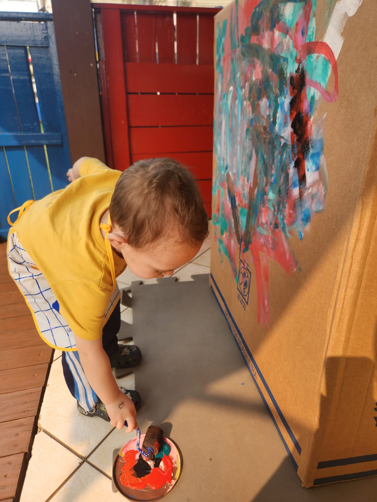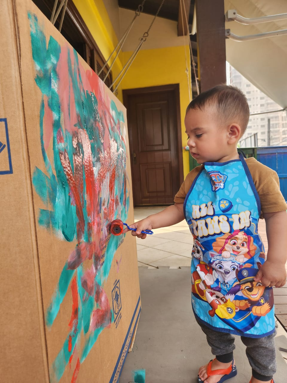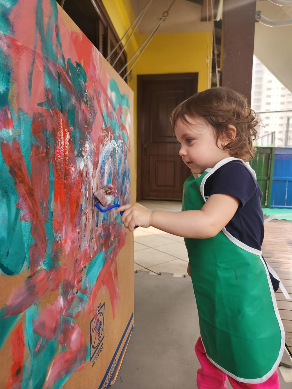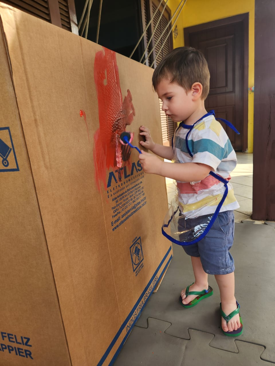 A atividade de pintura com tinta e rolos, estimula a coordenação motora fina, fundamental para o controle dos movimentos das mãos e dedos, habilidades essenciais para futuras tarefas como escrever e desenhar.