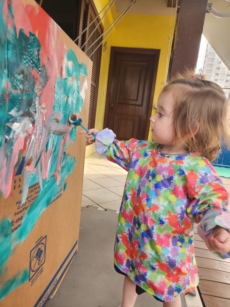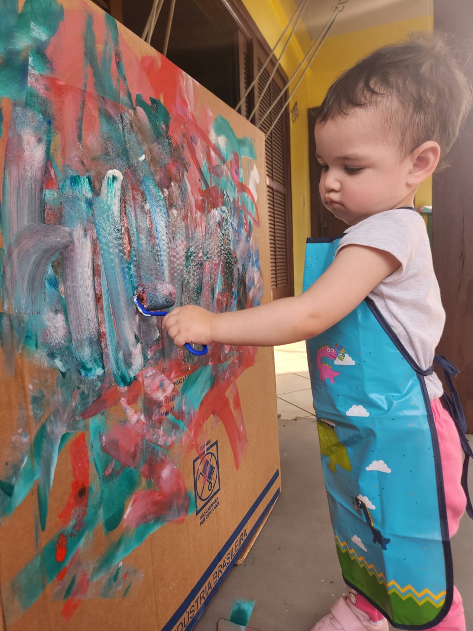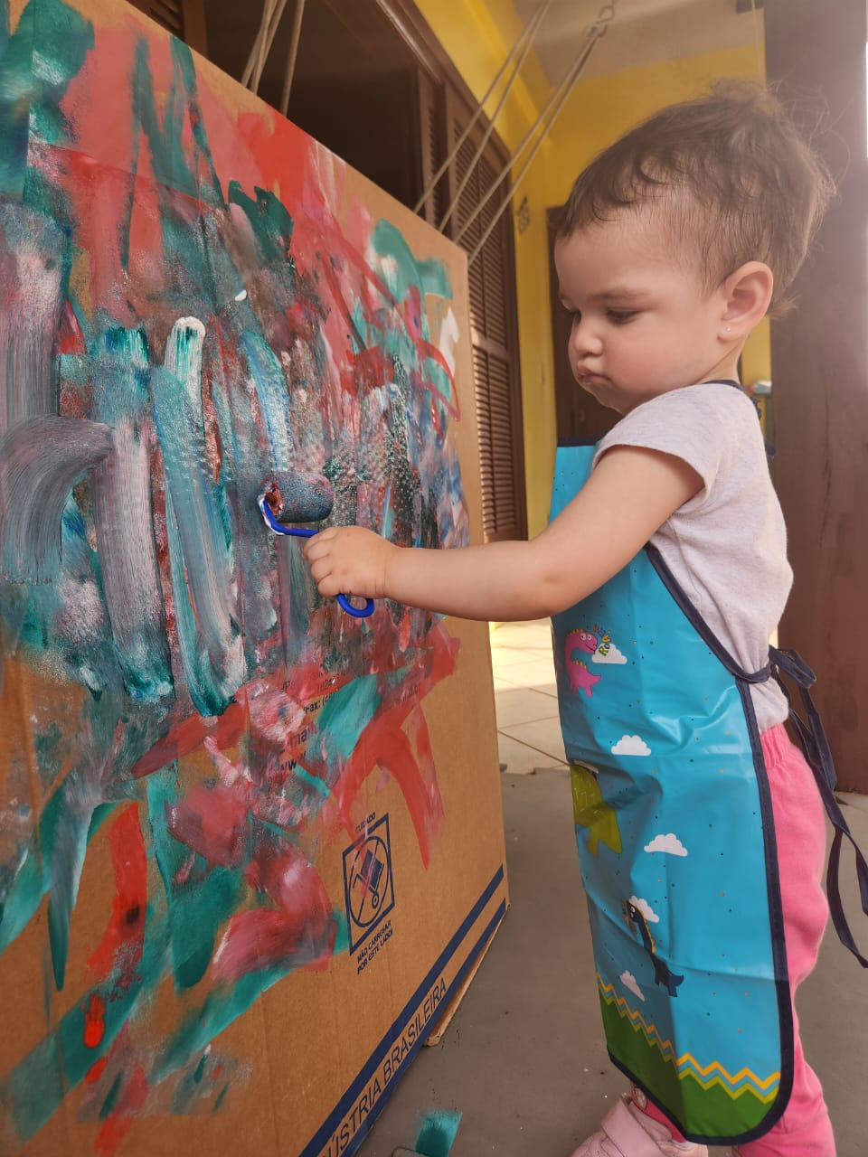 A pintura também incentiva a criatividade e a expressão individual, já que, nessa faixa etária, as crianças ainda estão explorando formas de se comunicar e de entender o mundo ao seu redor. O uso de rolos pequenos é especialmente interessante, pois oferece um desafio motor e visual diferente dos pincéis ou dedos, promovendo concentração,  coordenação e incentivando a criatividade.
