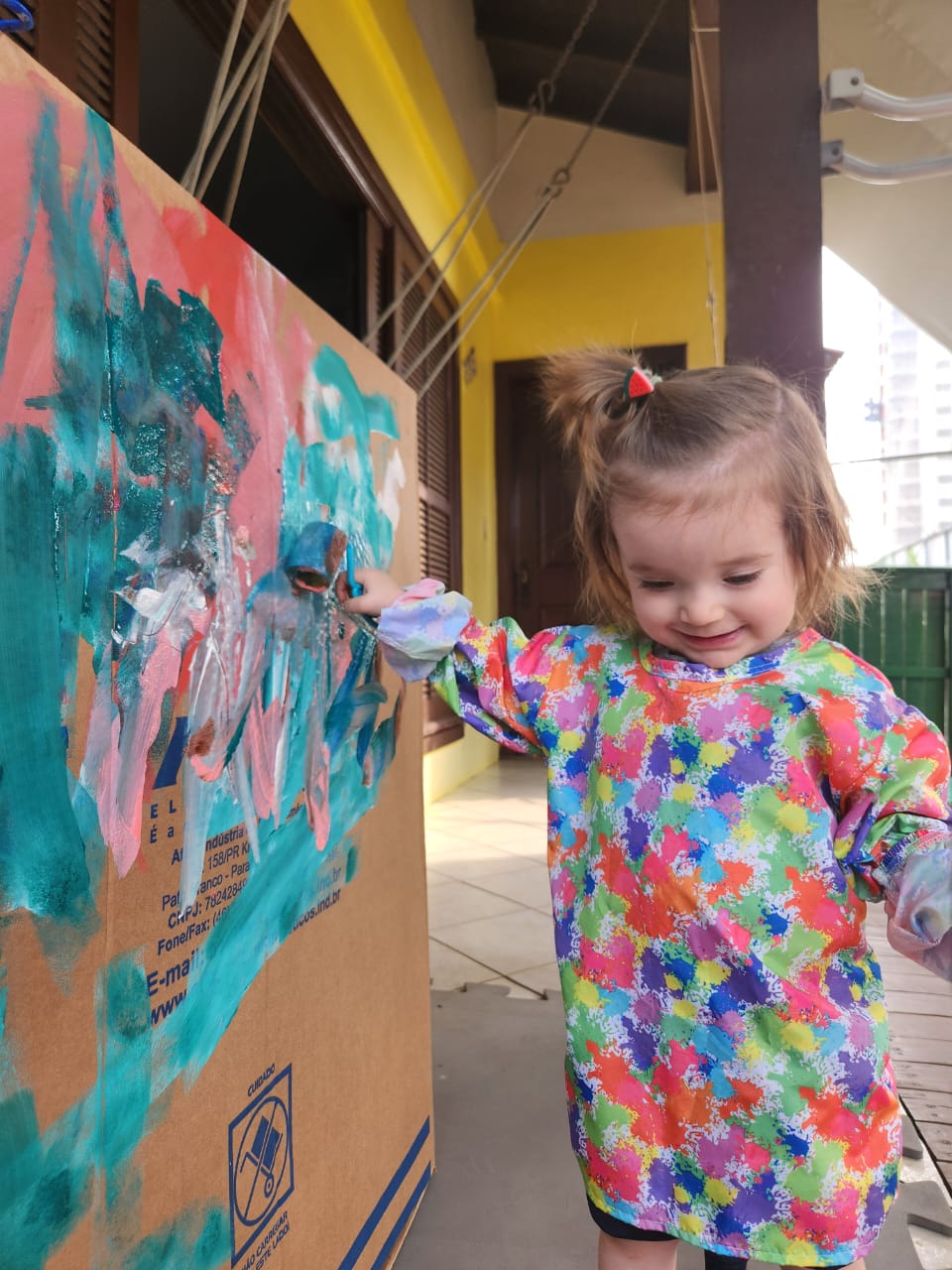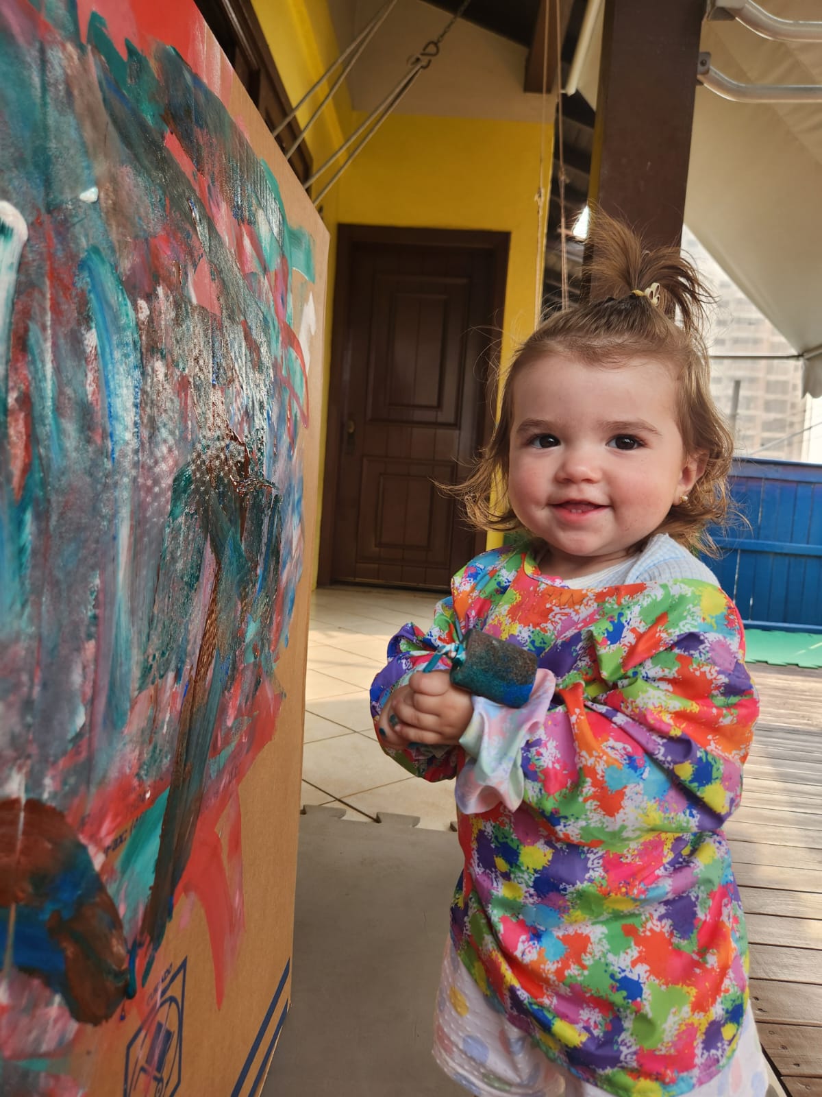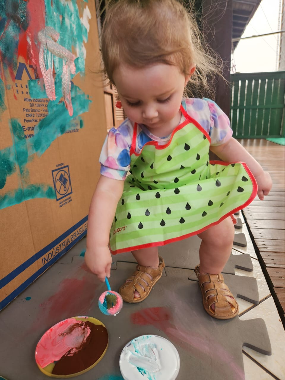 A pintura também incentiva a criatividade e a expressão individual, já que, nessa faixa etária, as crianças ainda estão explorando formas de se comunicar e de entender o mundo ao seu redor. O uso de rolos pequenos é especialmente interessante, pois oferece um desafio motor e visual diferente dos pincéis ou dedos, promovendo concentração,  coordenação e incentivando a criatividade.